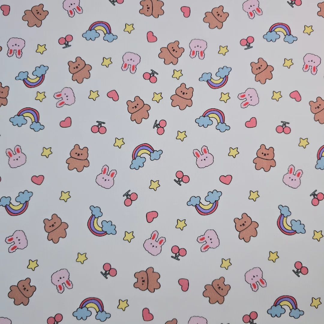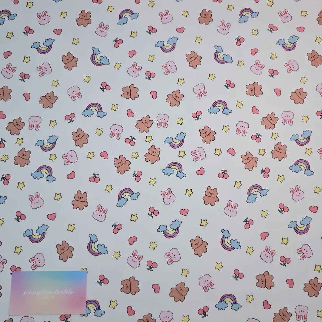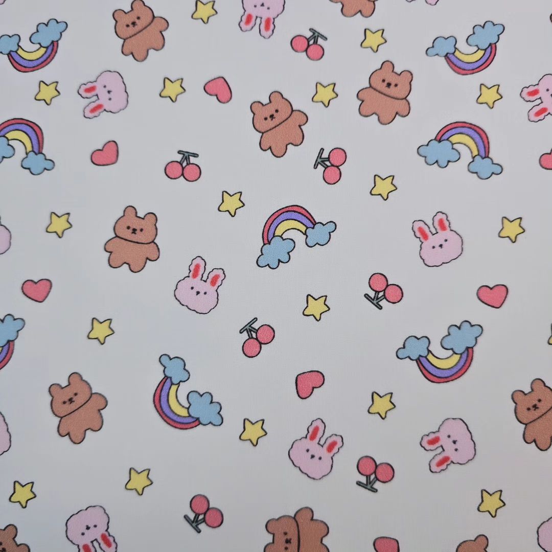 手描き風のクマとウサギの虹模様の生地、かわいい、子供用、裁縫、キルト - 韓国の生地