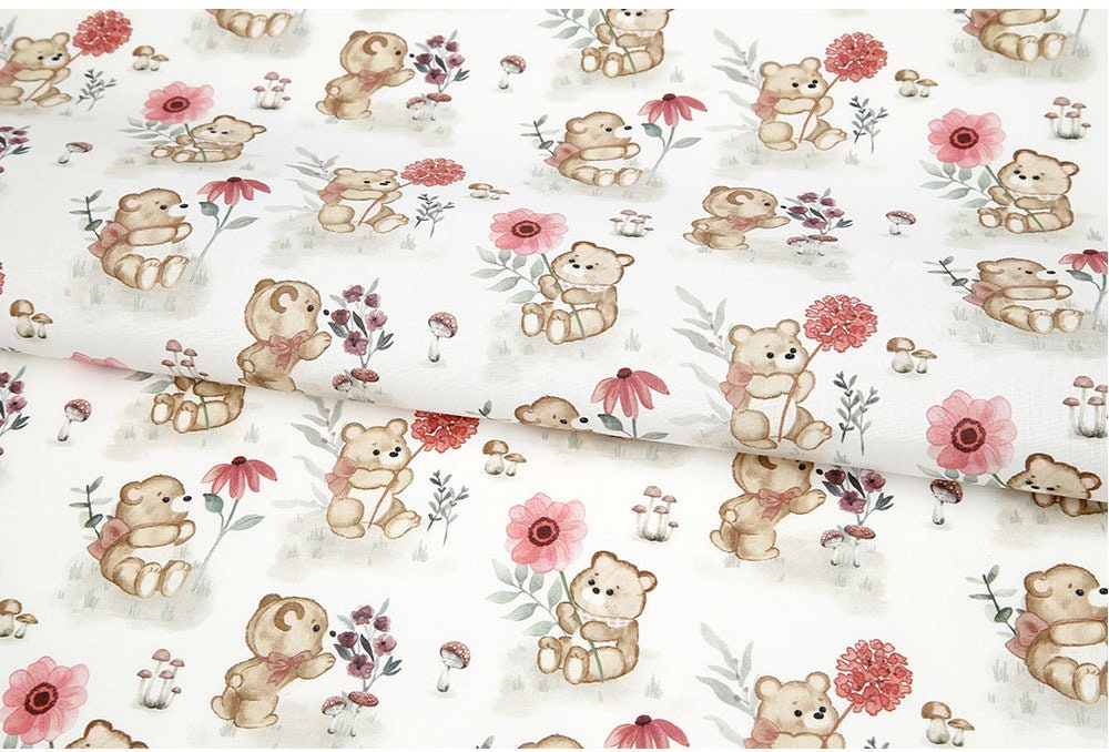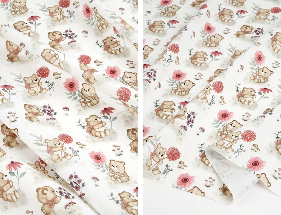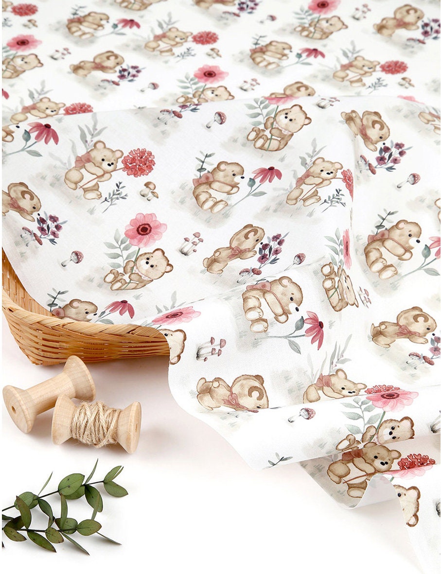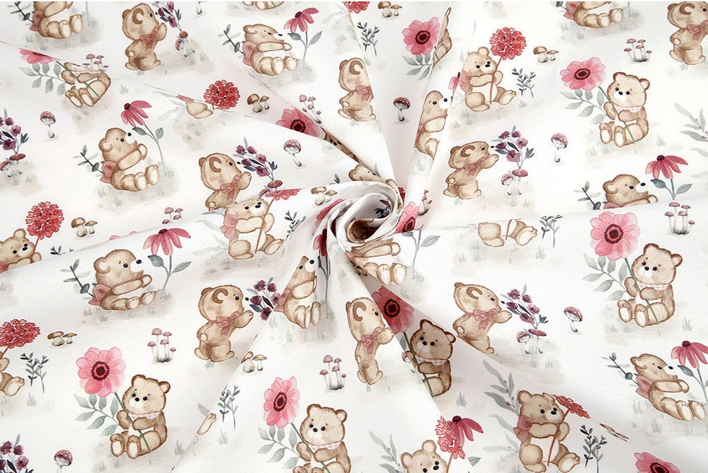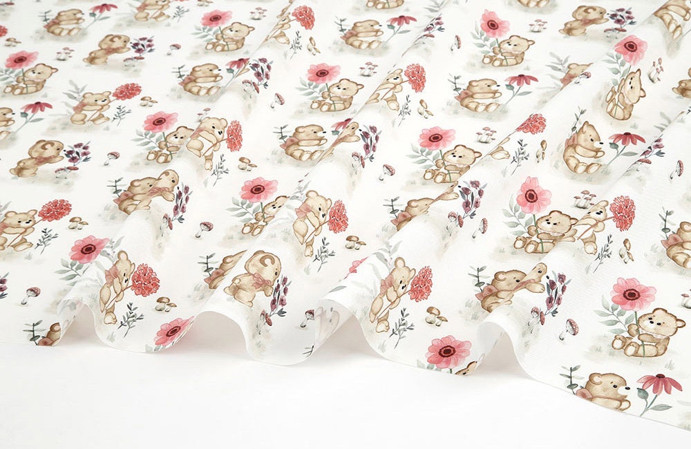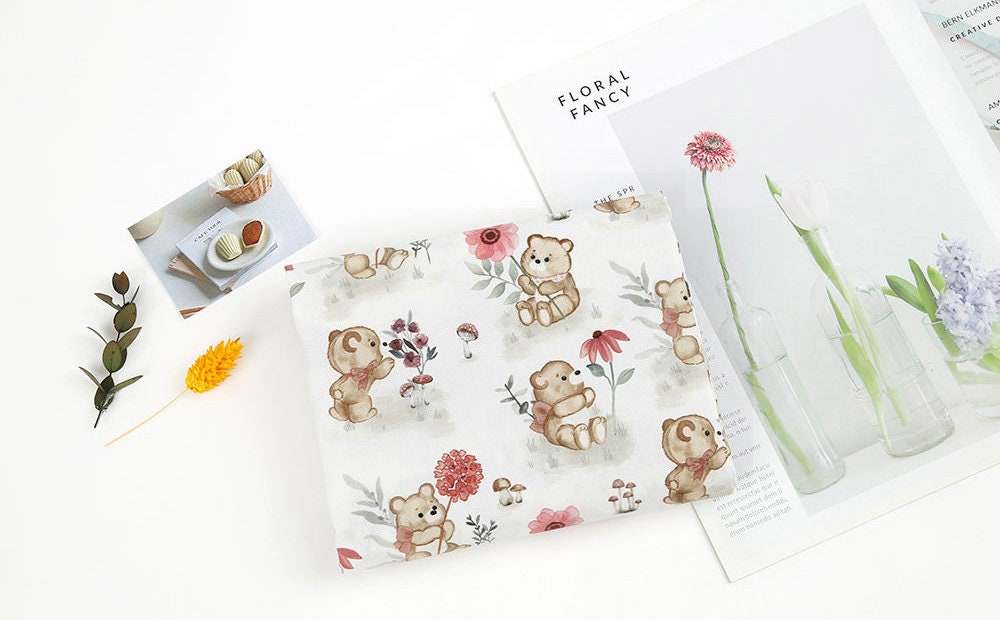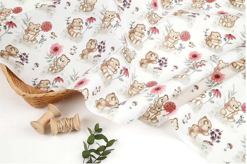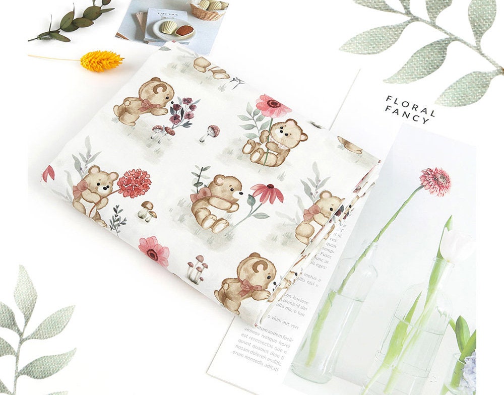 かわいい赤ちゃんクマと花柄の生地、動物の生地 - 韓国の生地
