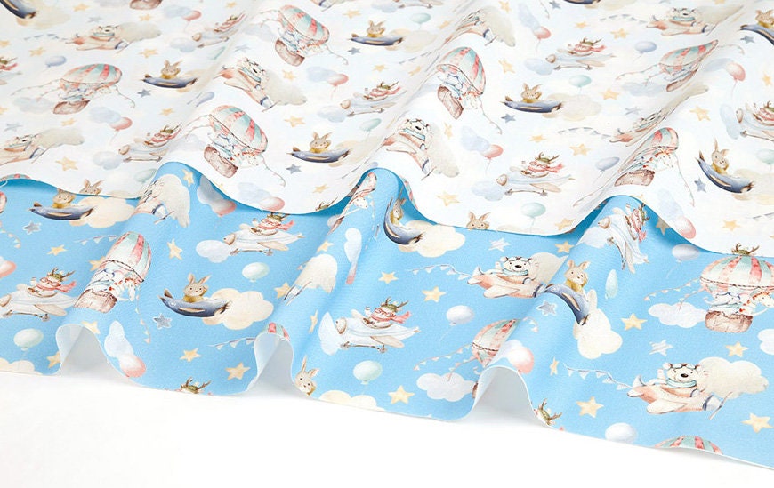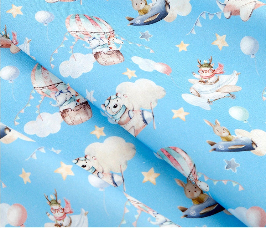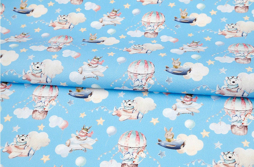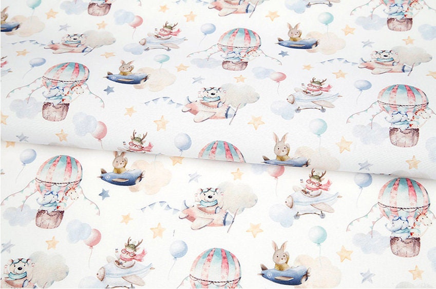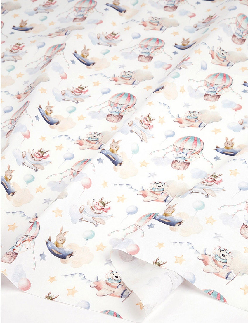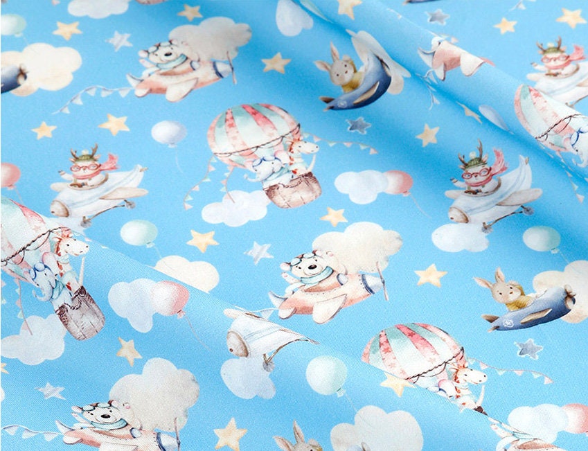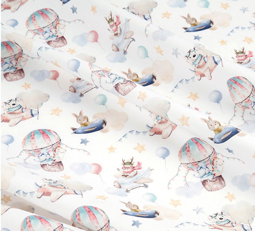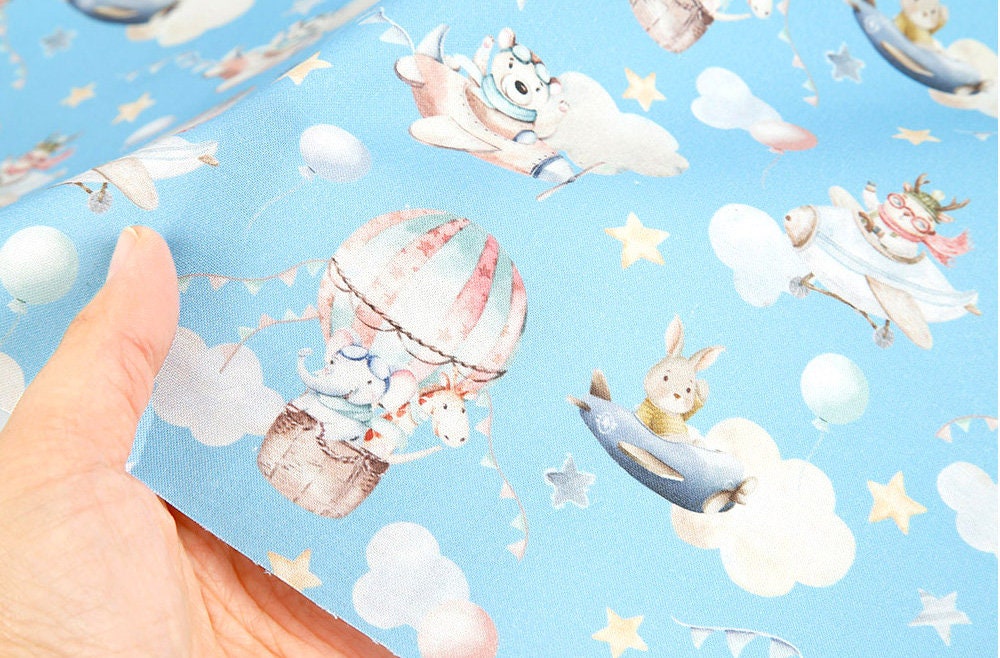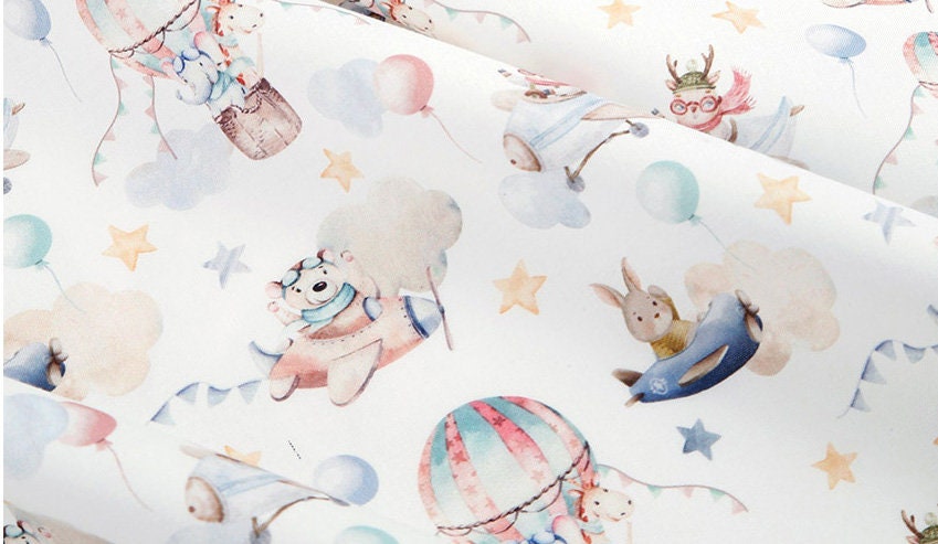 飛行機に乗ったかわいい動物、ウサギ、クマ、鹿、熱気球柄の生地、動物生地 - 韓国の生地