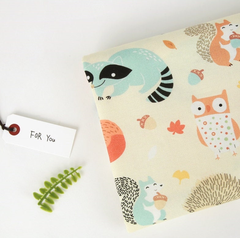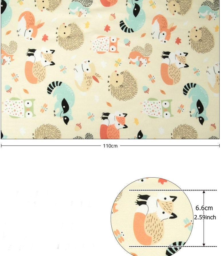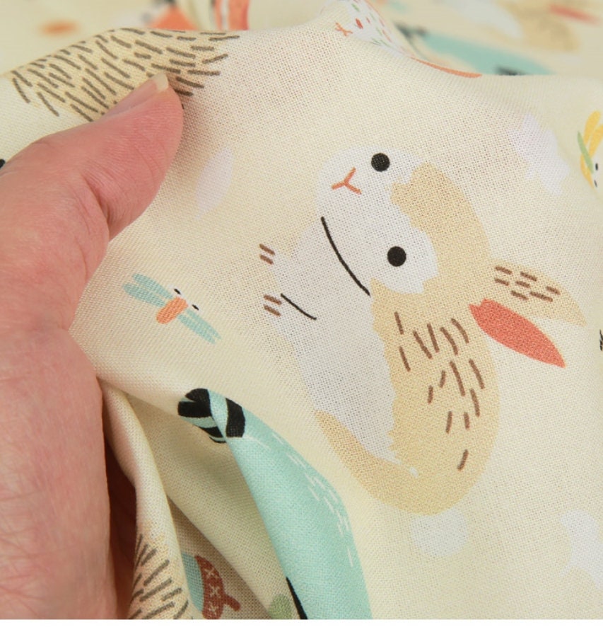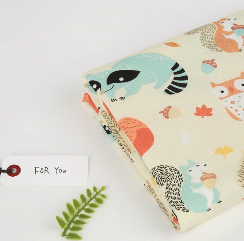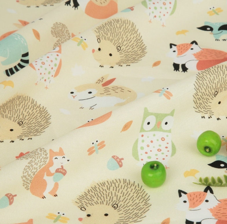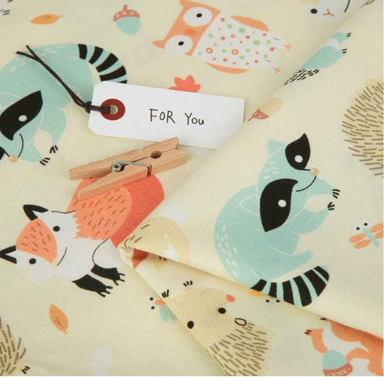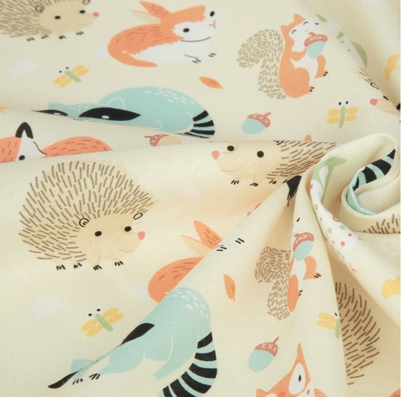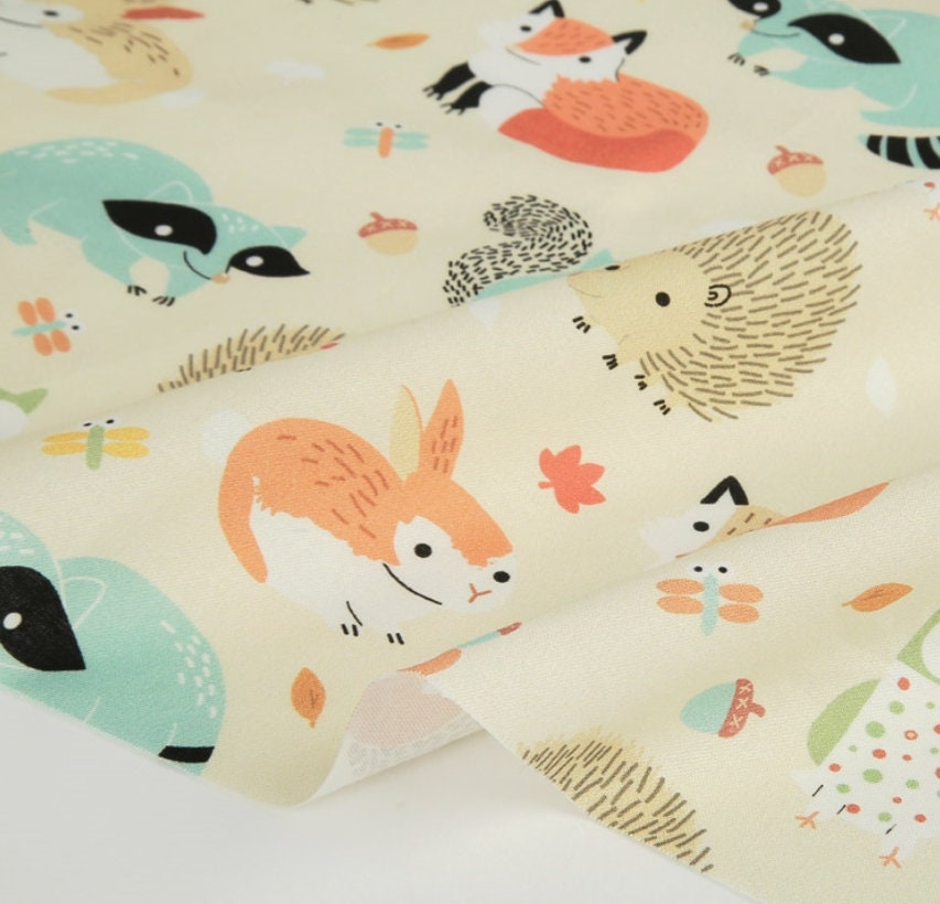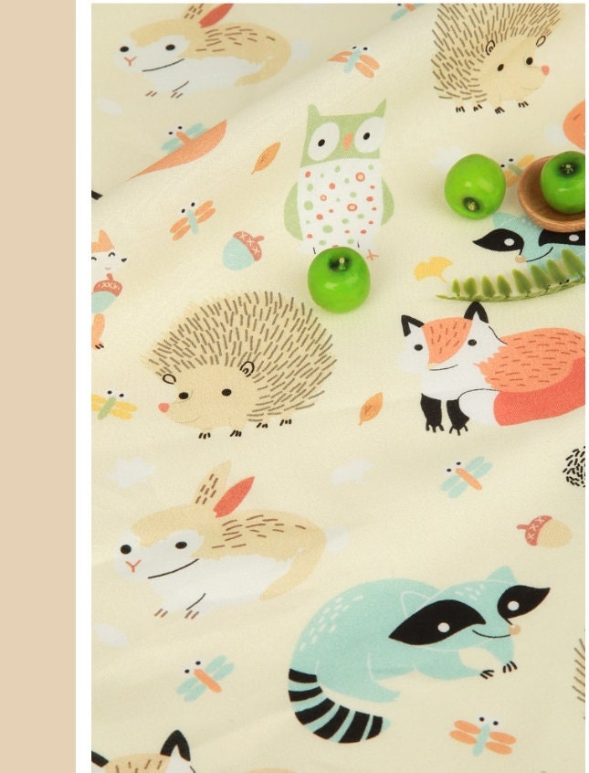 アニマルランド アライグマ ウサギ キツネ フクロウ ハリネズミ 生地、かわいい、子供、裁縫、キルト - 韓国生地