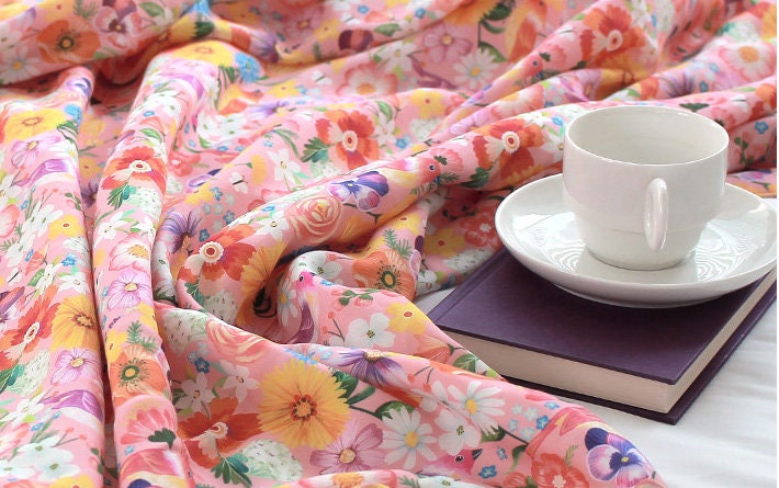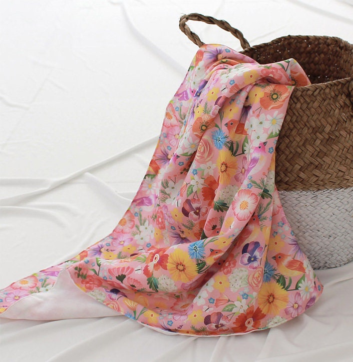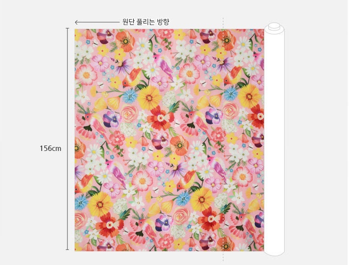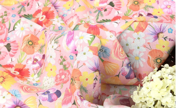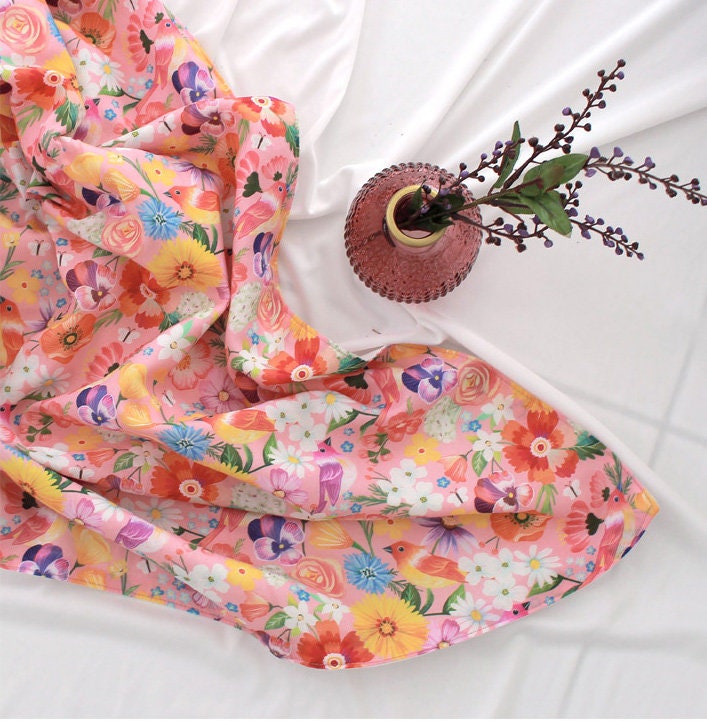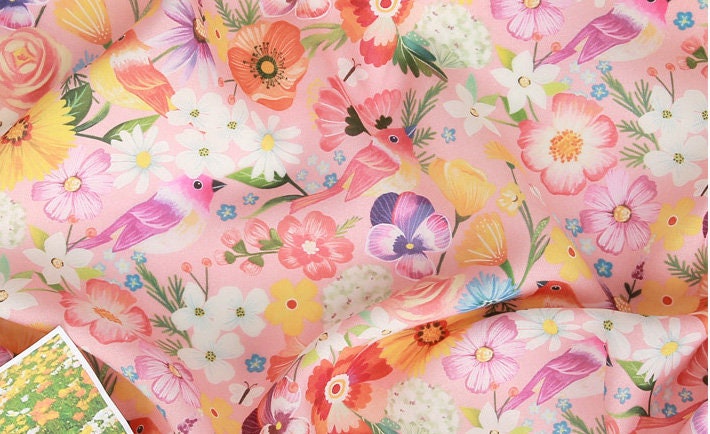 Pink Flower and Birds Patterned Fabric - Korean Fabric