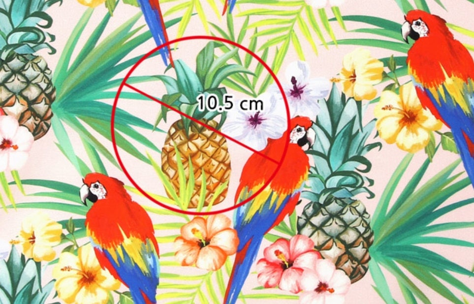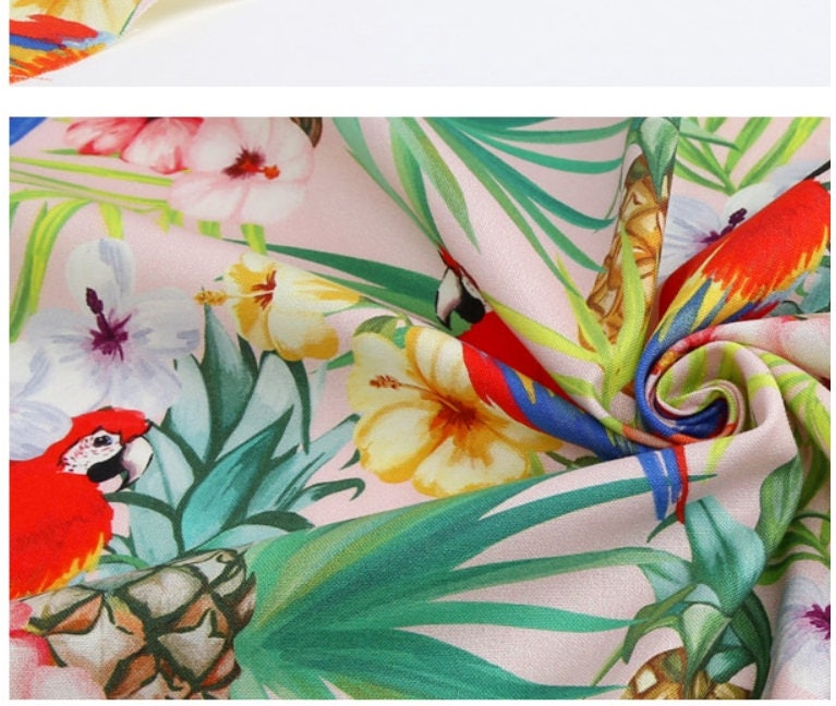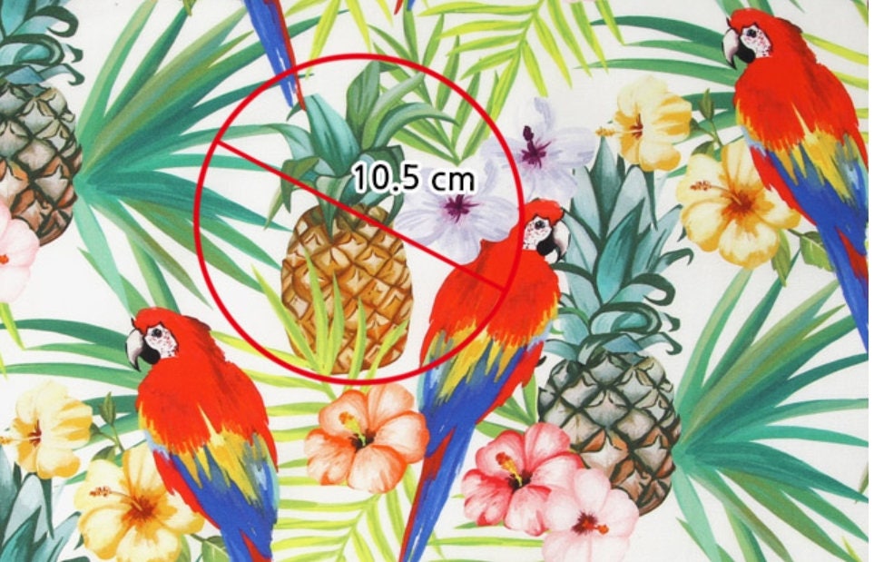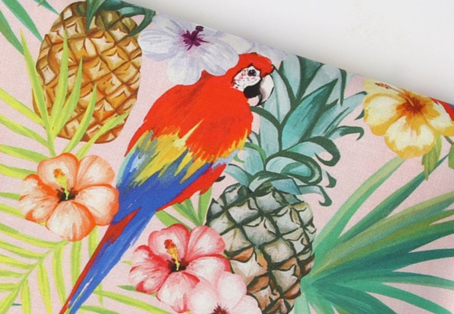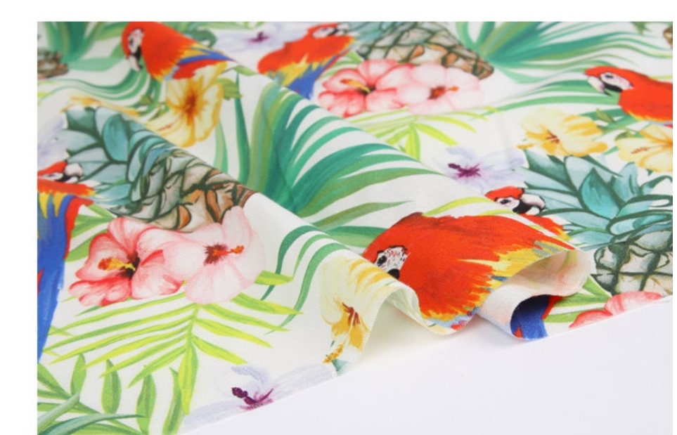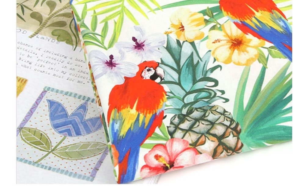 Tropical Leaves Hibiscus Pineapple Parrot Patterned Fabric, - Korean Fabric