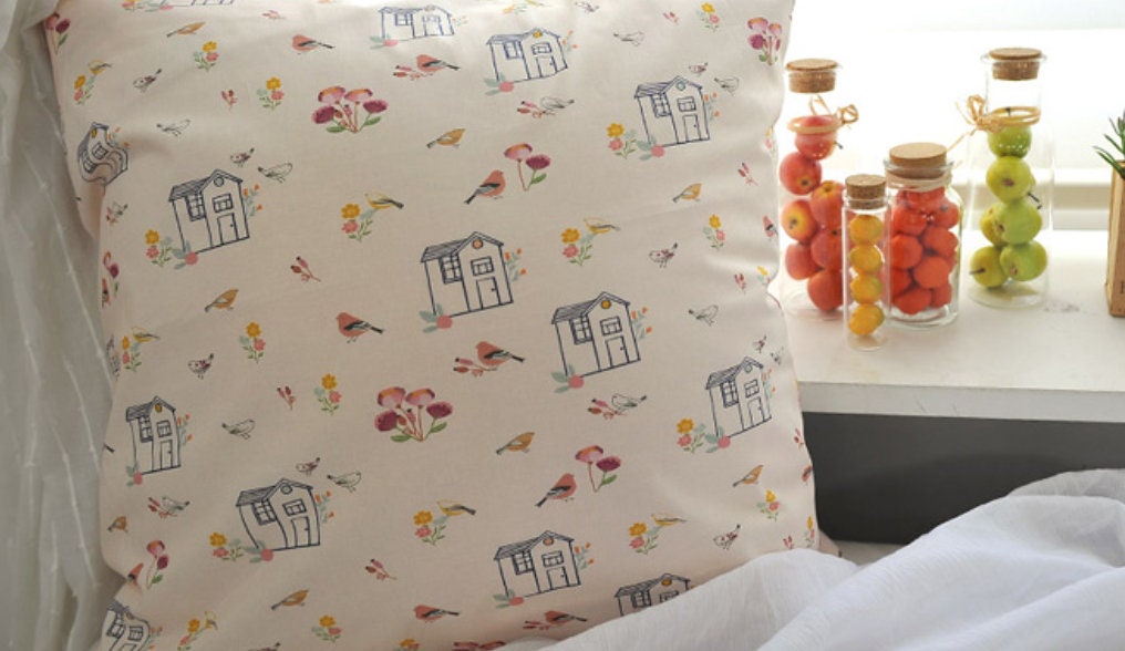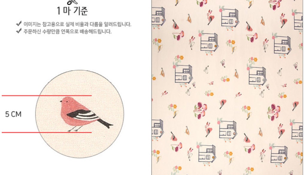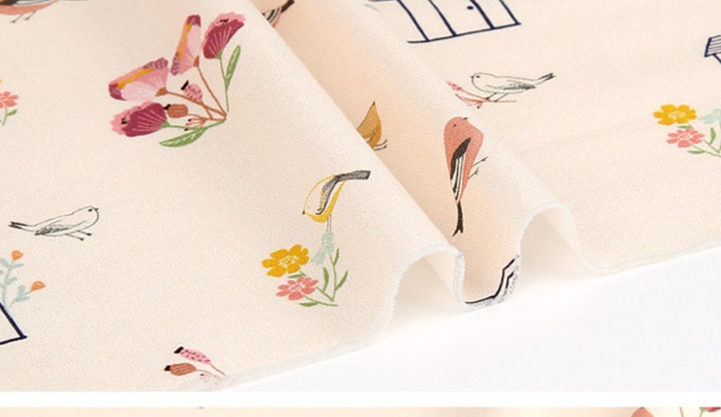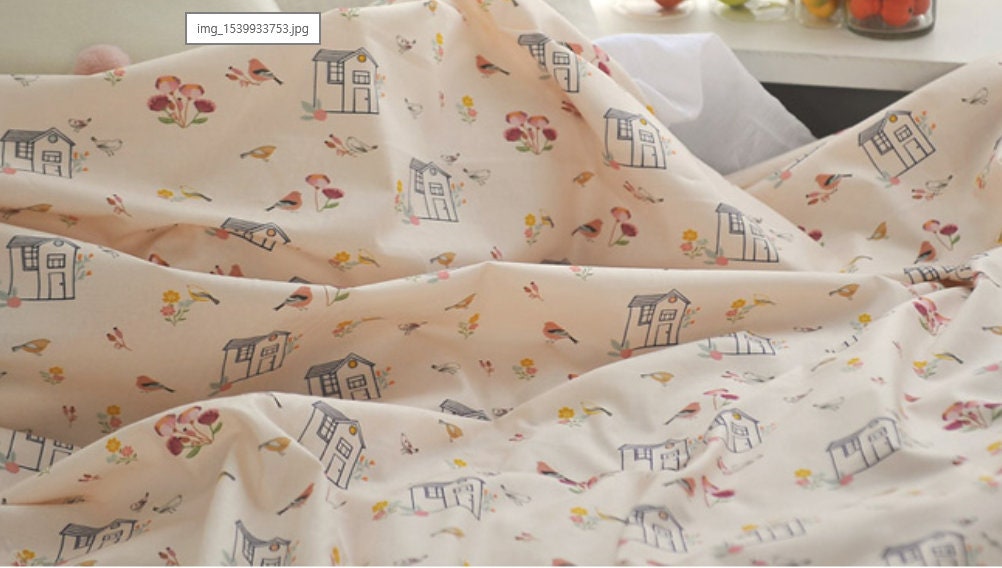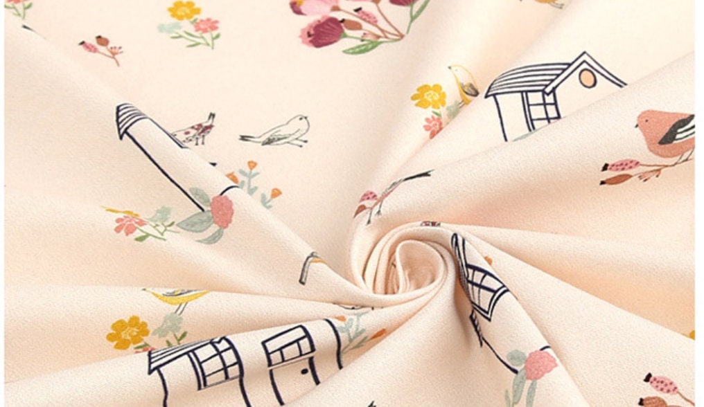 Birds Flowers House Patterned Fabric - Korean Fabric