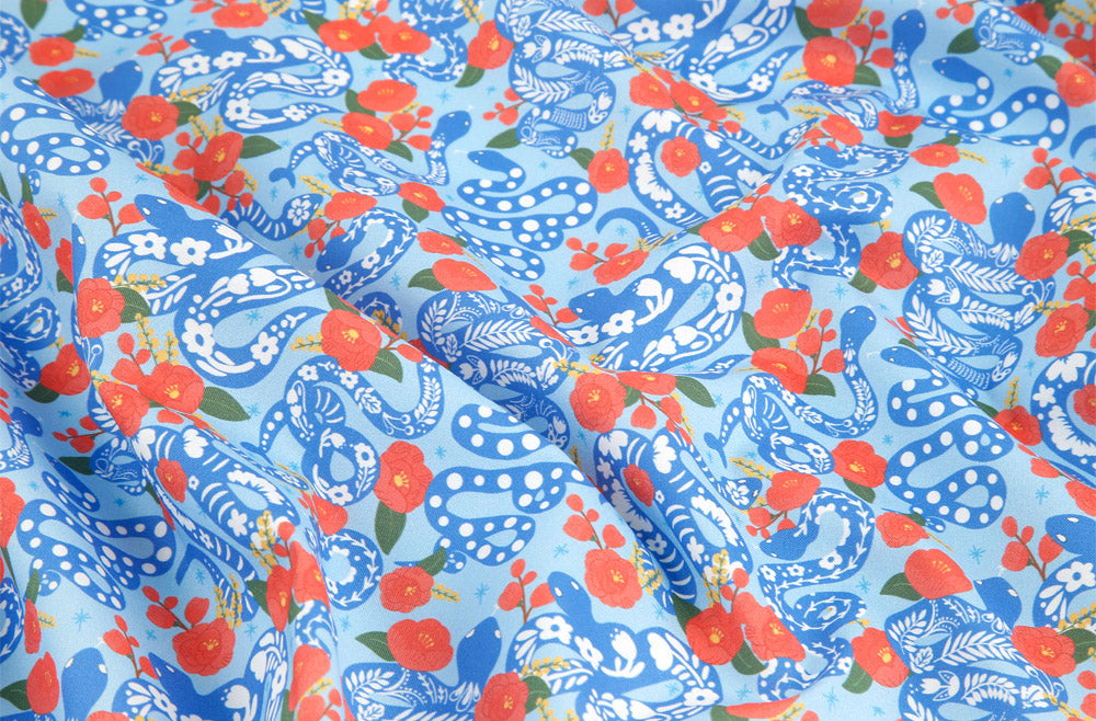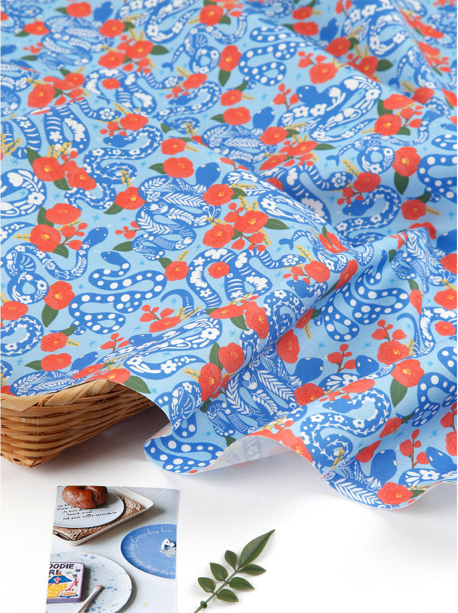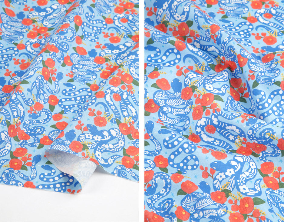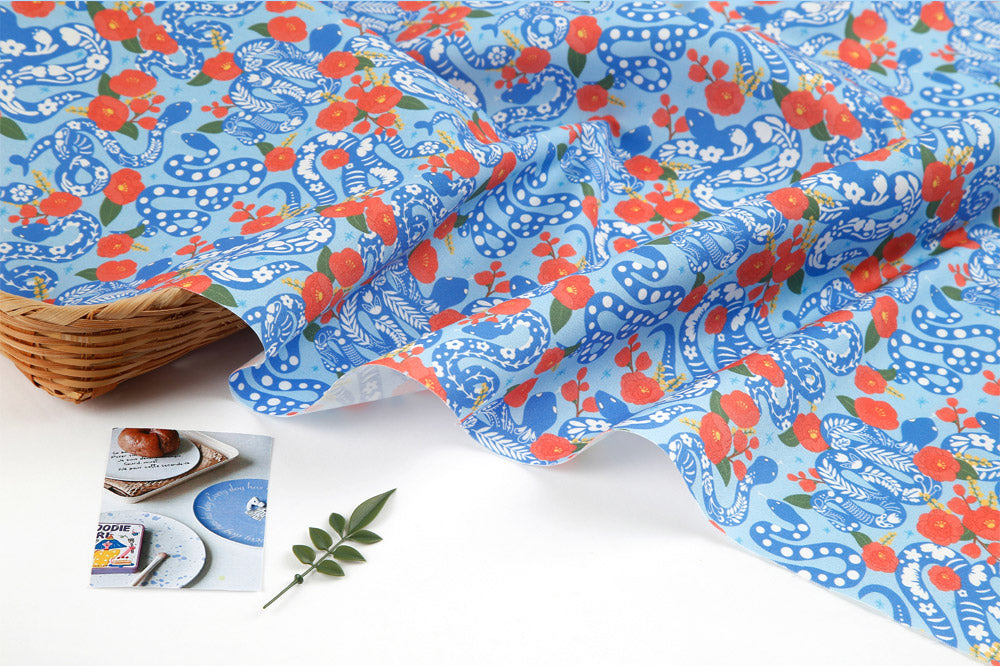 Camellia and Blue Snake Patterned fabric - Korean Fabric